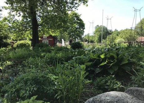 Därefter tog hustrun Meta oss på en vandring genom trädgården och beskrev kunnigt växterna och hur de planterade och odlade dem. Det var många besökare denna dag, och parkeringen var välfylld med bilar, så Meta blev tvungen att avbryta visningen för att hjälpa till i caféet.